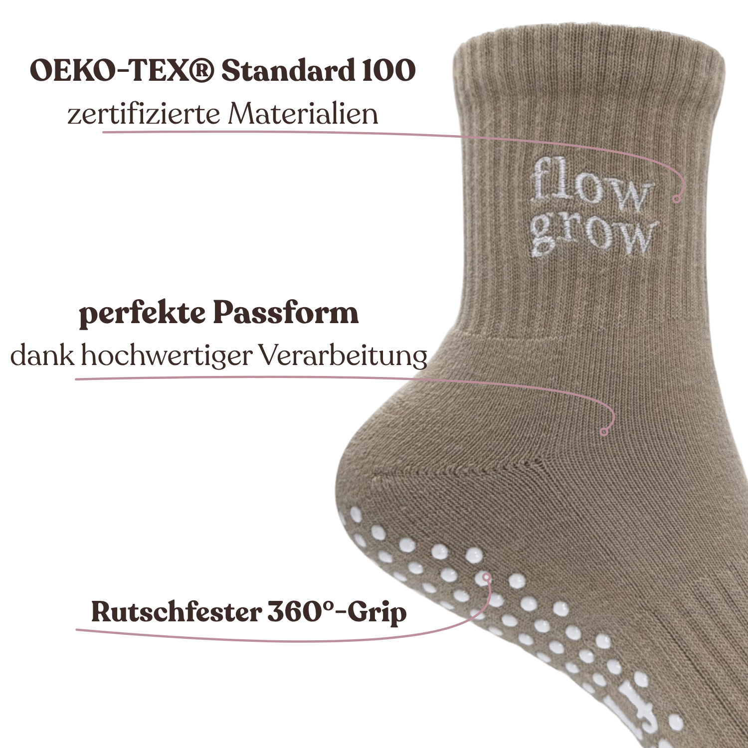 Latte Flow überzeugt durch dezente Farben und minimalistisches Design. Die weiche Baumwollmischung macht sie besonders angenehm, während die Anti-Rutsch-Grips für Stabilität sorgen.