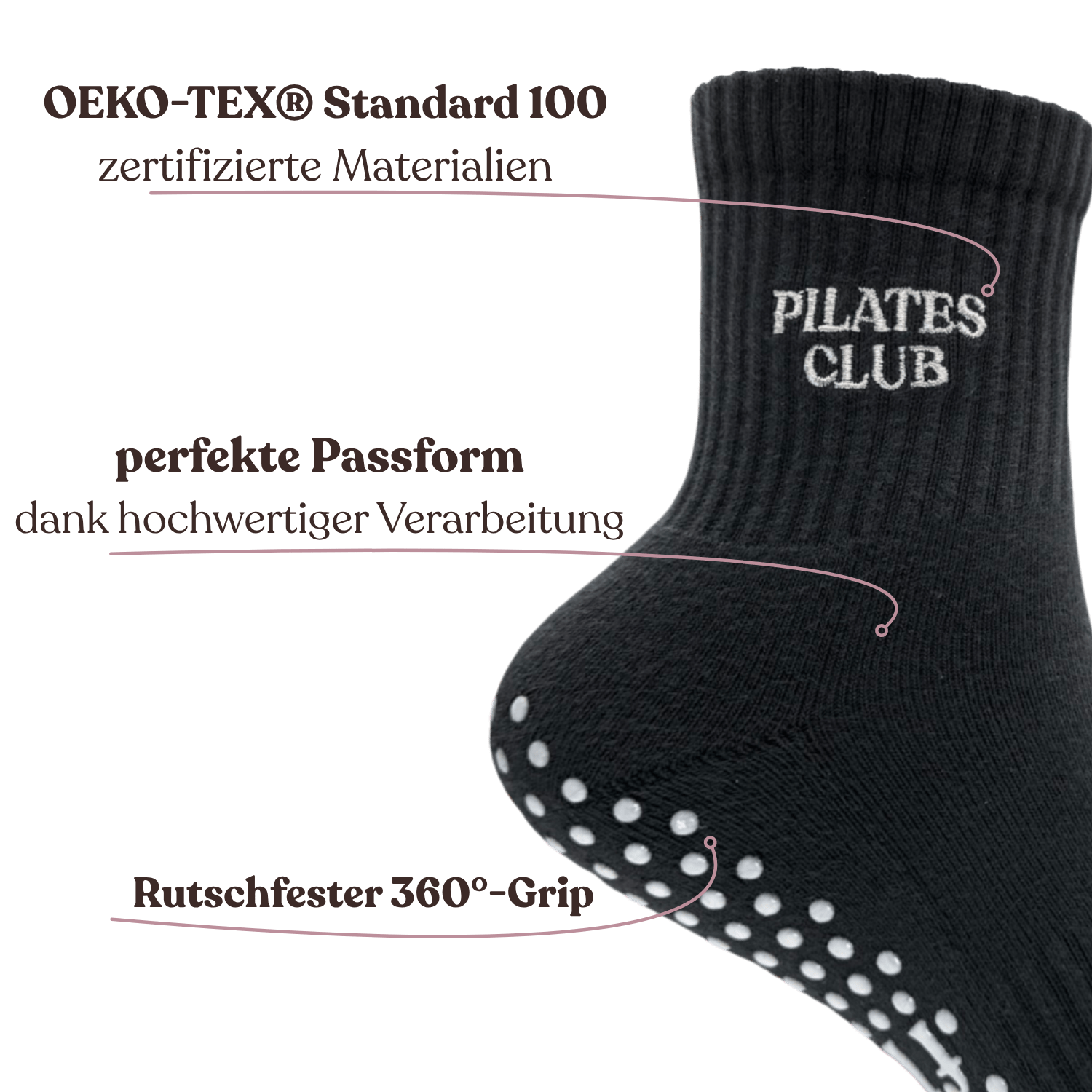 Pilates Club Black ist die urbane Variante der Club-Reihe. Cooles Schwarz, dezente Akzente und ein funktionales Grip-System machen sie zu einem universellen Allrounder.