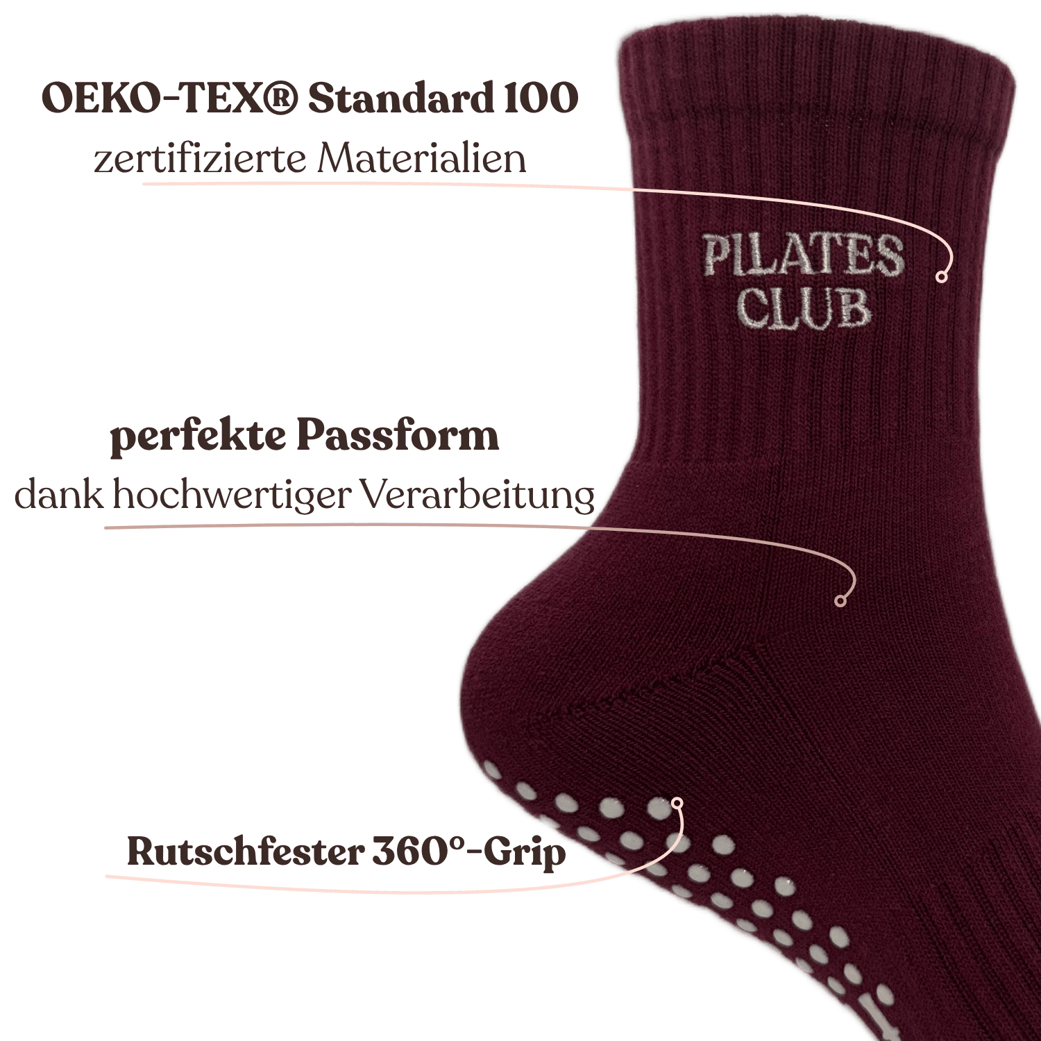 Die Pilates Club Burgundy Socken sind dein perfekter Begleiter für jedes Training – egal ob Pilates, Yoga oder Barre.